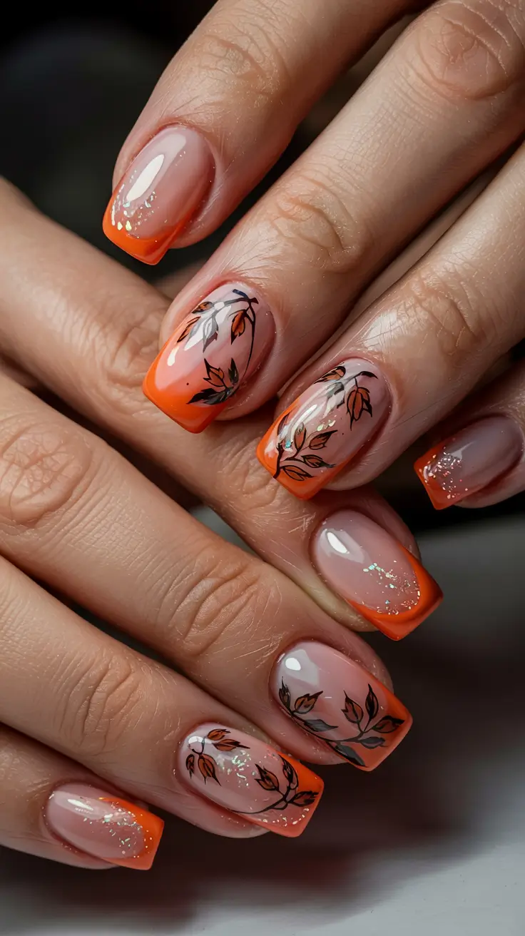 Чтобы добиться такого эффекта, я бы использовала «Cajun Shrimp» от OPI или «Playing Koi» от Essie на оранжевом крае и прозрачную основу, например «Ballet Slippers» от Essie. Для прорисовки листьев проще использовать тонкую кисть для нейл-арта и чёрный или тёмно-коричневый гель-лак, чтобы создать плавные органические формы. Верхнее покрытие с микроблестками завершает образ и придаёт ему морозное мерцание.