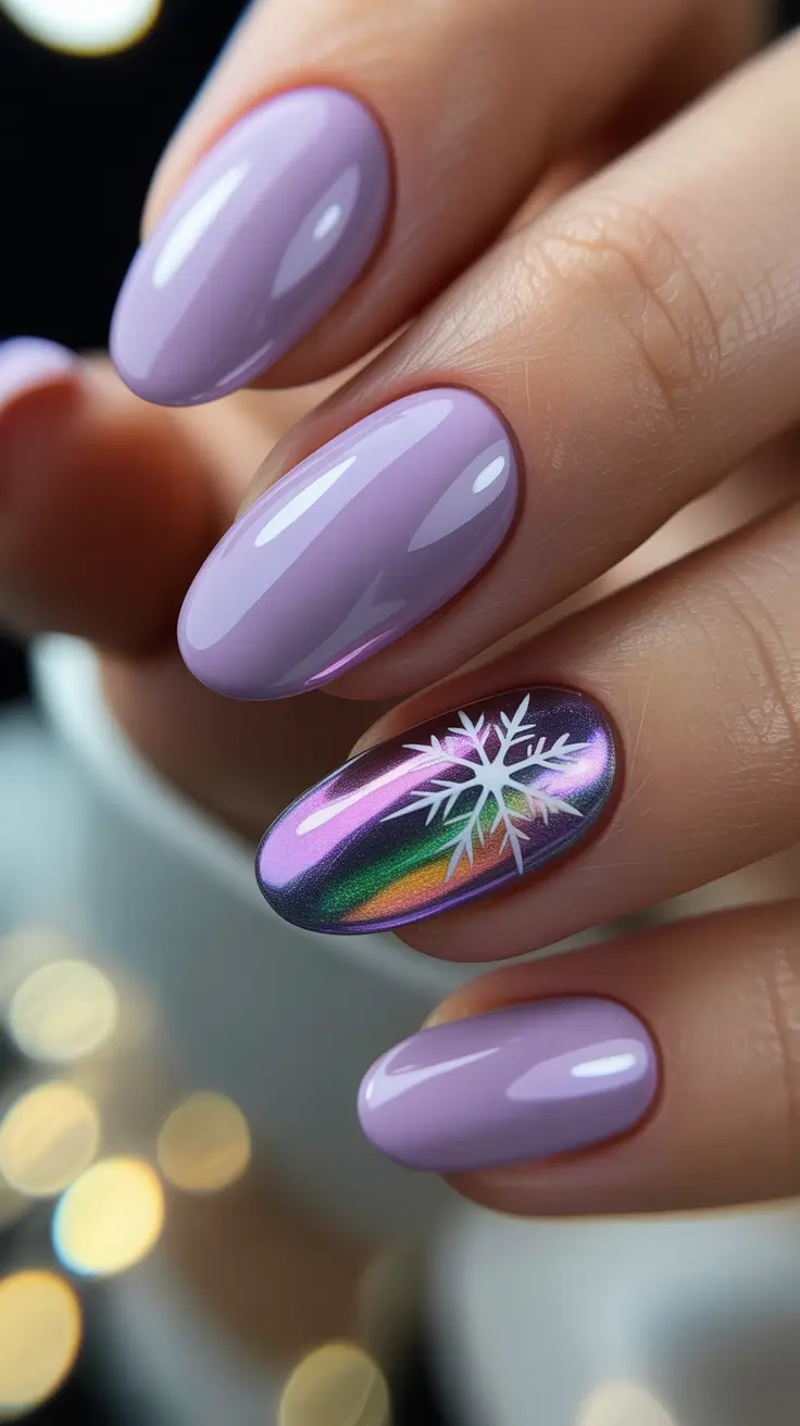 В холодные месяцы сиреневый маникюр выглядит красиво и безмятежно. Этот оттенок похож на мягкий, чистый и спокойный свет зимнего утра. Это также простой и в то же время праздничный зимний маникюр, а акцентный ноготь придаёт ему игривый вид благодаря металлическому градиенту и изящному мотиву в виде снежинок. Сочетание минимализма и причудливости Мне нравится это сочетание. Я считаю, что оно хорошо подходит для праздничного бранча или тёплого воскресного дня в помещении.