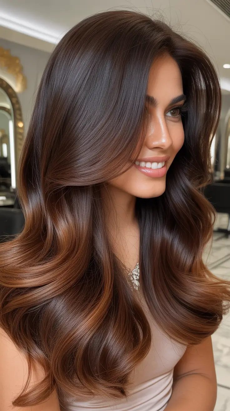Это одновременно дружелюбный и дерзкий оттенок — основа для брюнеток с волнами корично-медного, которые сразу же придают образу теплоту. Эта смесь стала одним из самых обсуждаемых трендов в окрашивании брюнеток в 2026 году, потому что она придаёт традиционному каштановому цвету больше жизни. Мне нравится, как медные оттенки подчёркивают черты лица; они освежают цвет лица, как будто в нём уже есть тёплый свет.