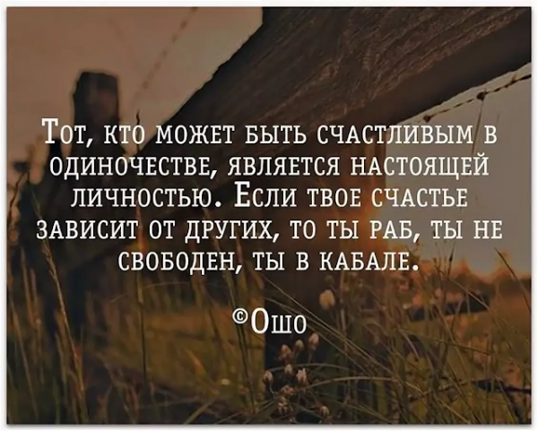 Еще одну умную мысль высказал индийский духовный гуру Ошо. Он предположил, что женщина никогда не будет счастлива, если не чувствует себя комфортно в одиночестве. Такой вечно кто-то нужен, чтобы держаться за него, ее стержень — это муж, ребенок, дело. А сама по себе — она лишь рамка от картины, которая не представляет собой никакой ценности.