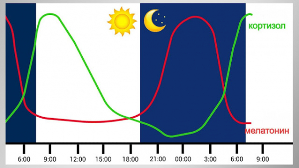 Кортизол — «жаворонок», который максимально вырабатывается в утренние часы, даря нам хороший аппетит и бодрость. Мелатонин — «сова» и его задача — усыпить нас, замедлить все внутренние процессы, чтобы за их счет активизировать регенерацию клеток организма.